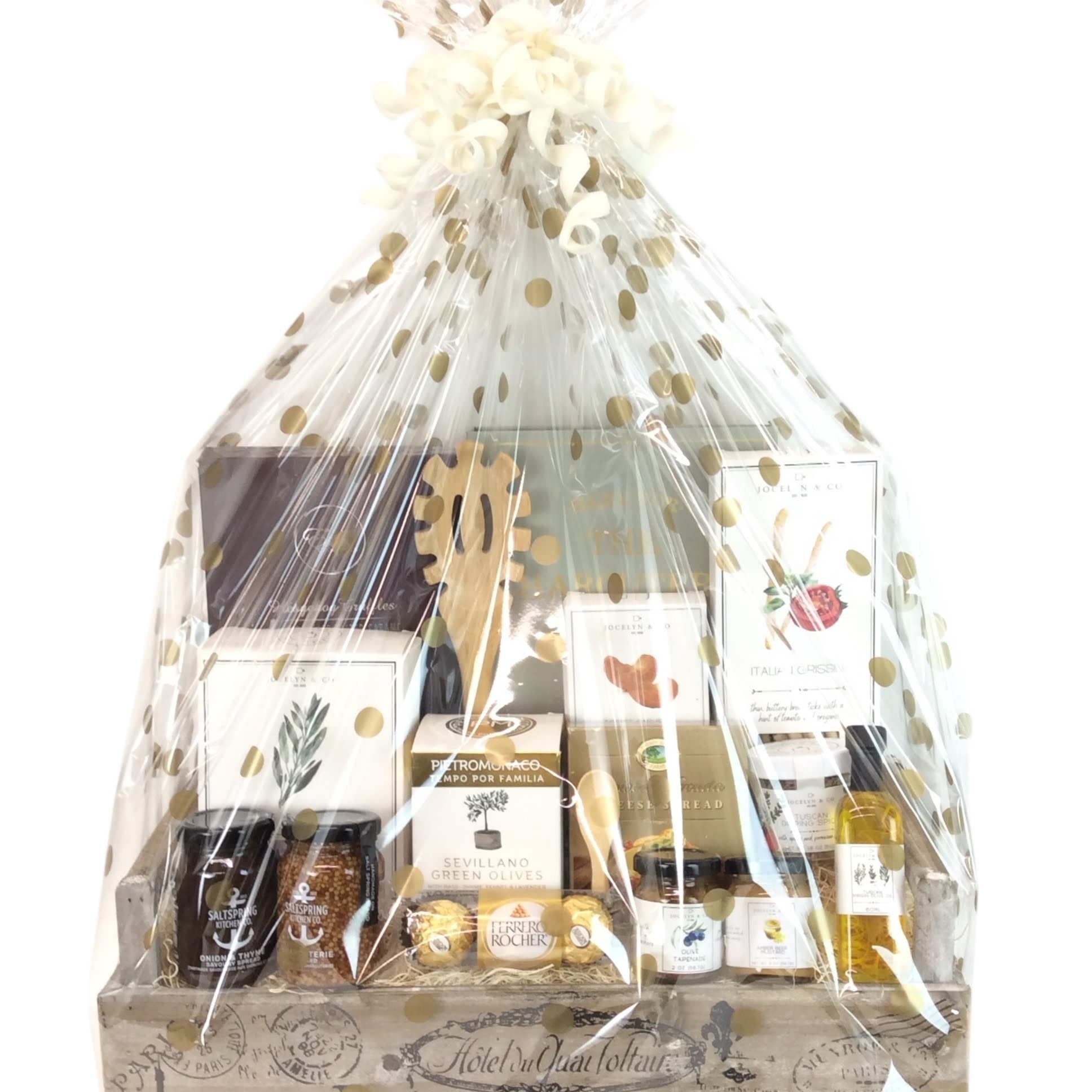 CloseA sophisticated gift designed to delight the senses. This beautifully arranged basket features a luxurious assortment of crackers, spreads and treats. This gift is ideal for celebrations, client appreciation, or sending a touch of "luxury" just because.