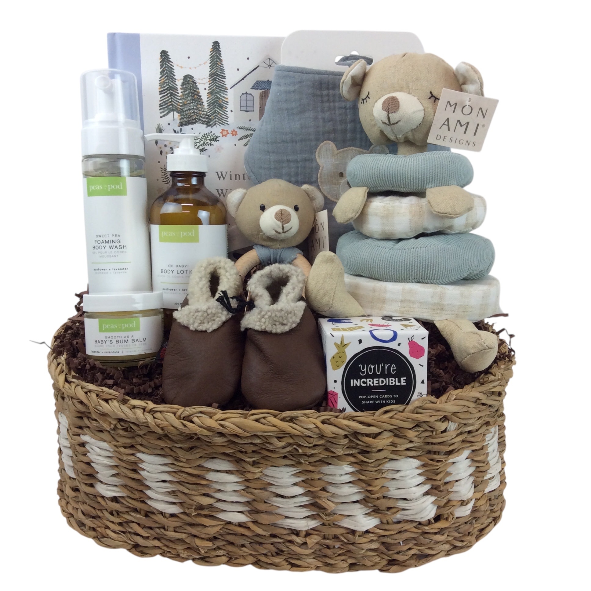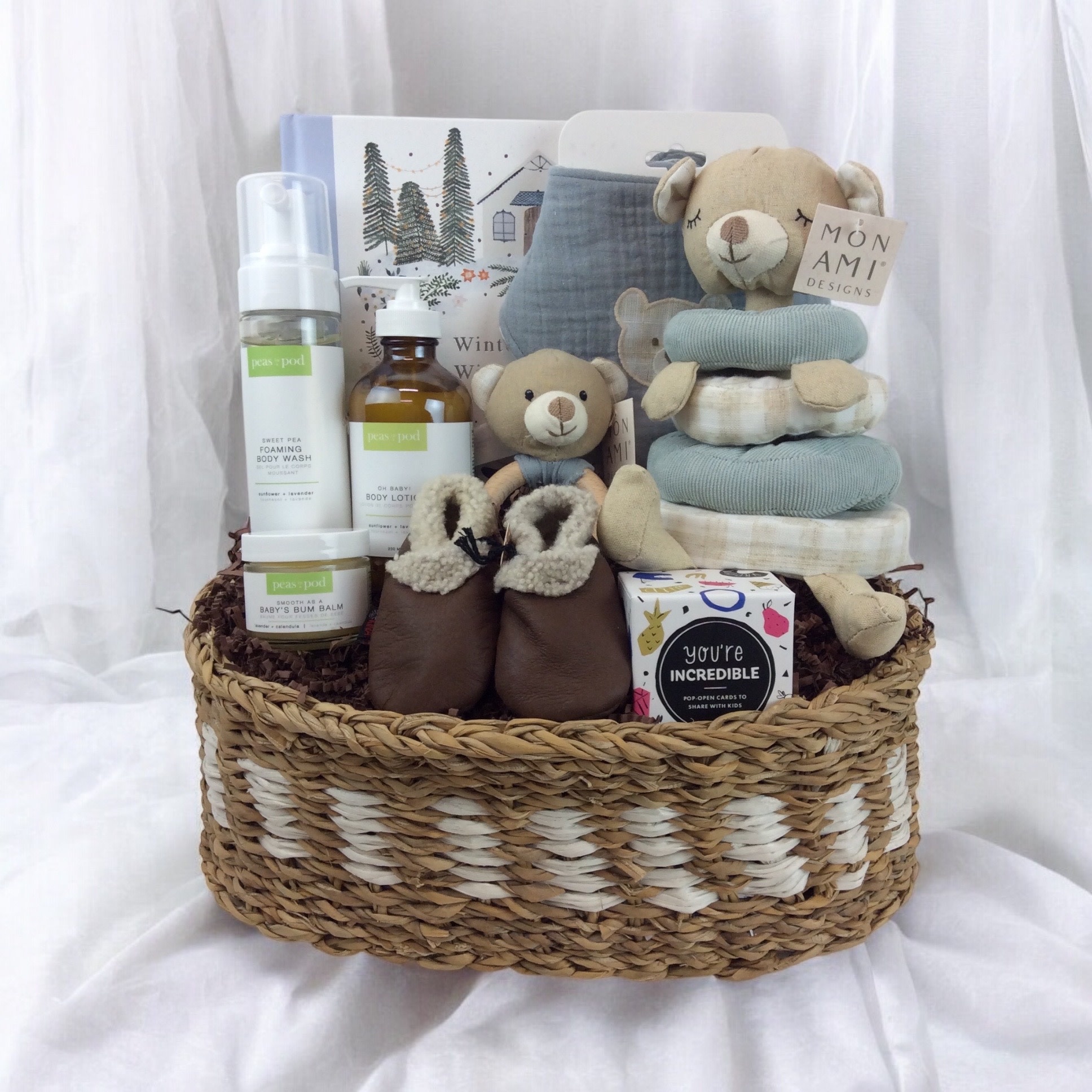 Wrapped up in an elegant weaved stripe basket that will be great for decoration and storage in the nursery!
