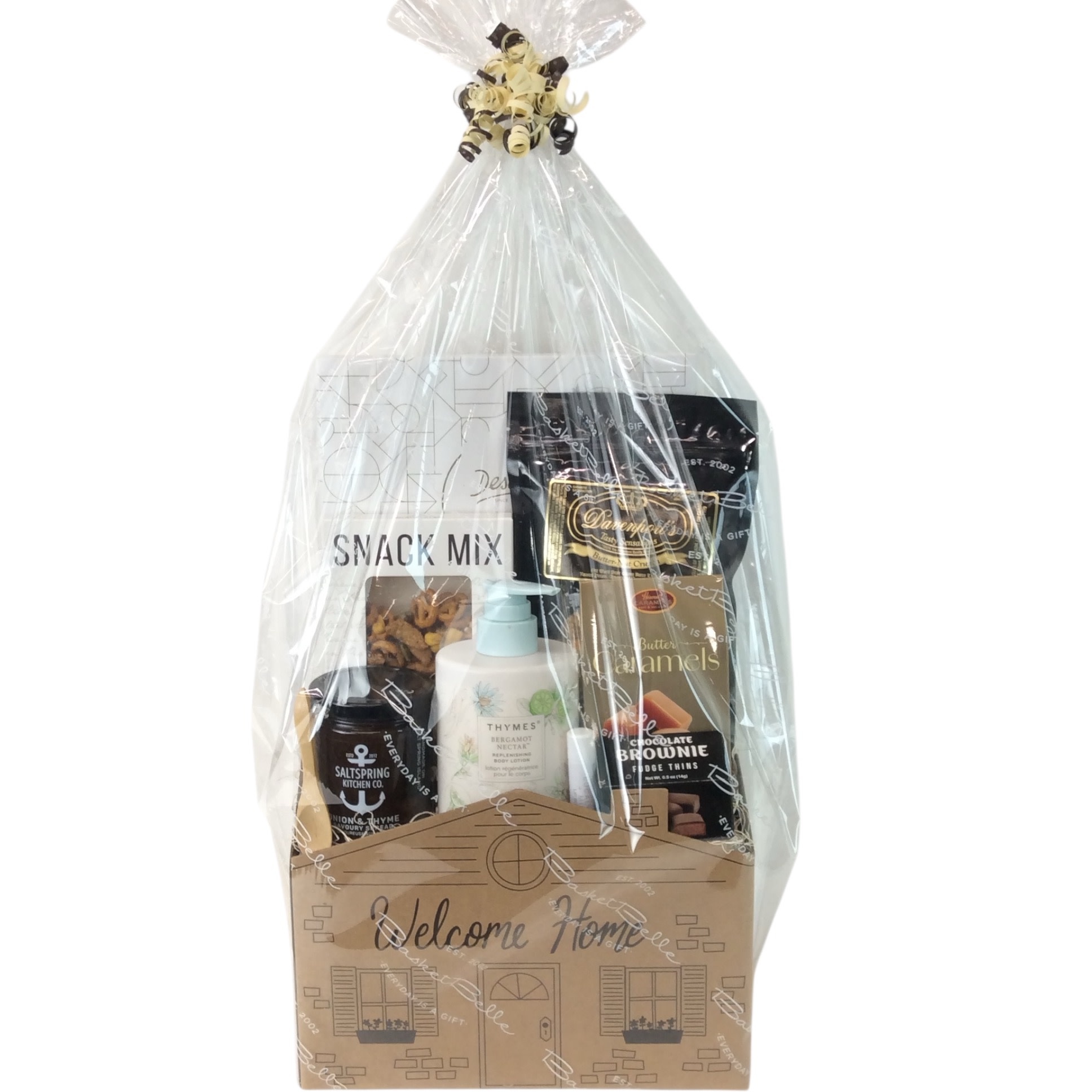 Designed in an adorable "Welcome Home" house box, wrapped in our signature BasketBelle finishing wrap and tied off with colourful ribbon!