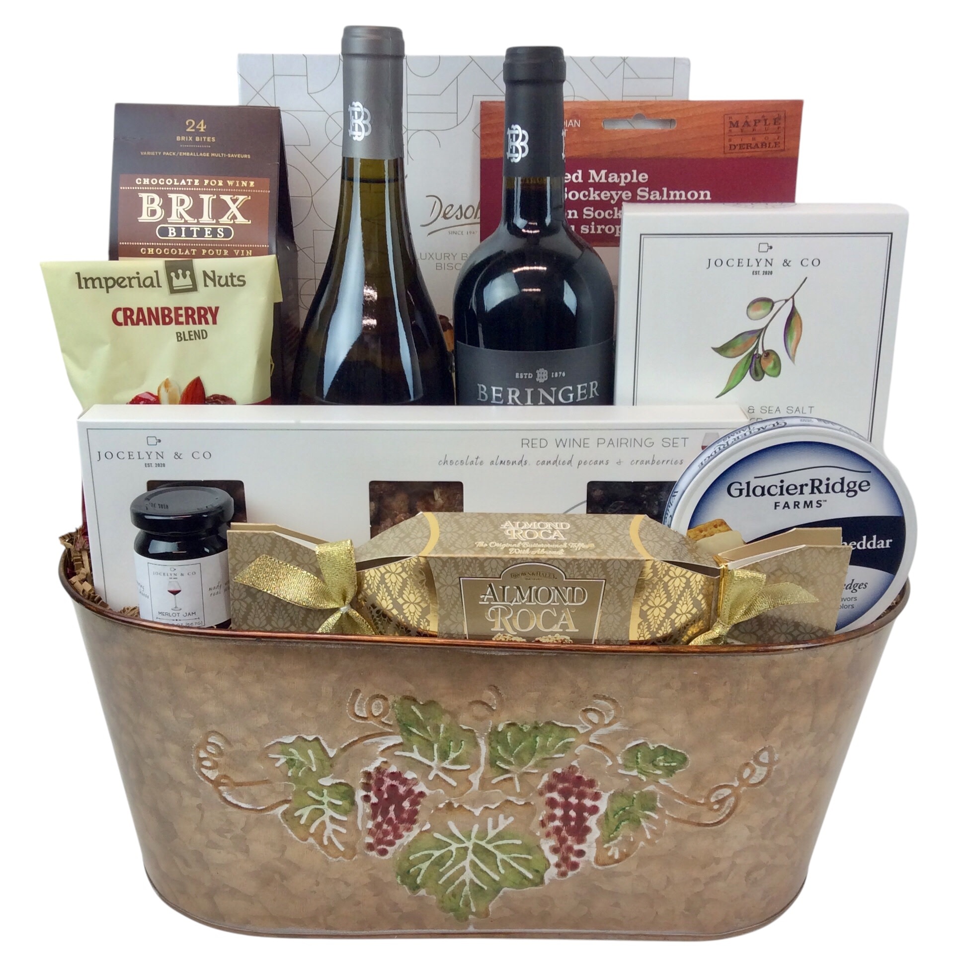 Each basket comes with a pairing of Red and White Wine along with crackers, cheese, jelly or jam and a sweet treat.